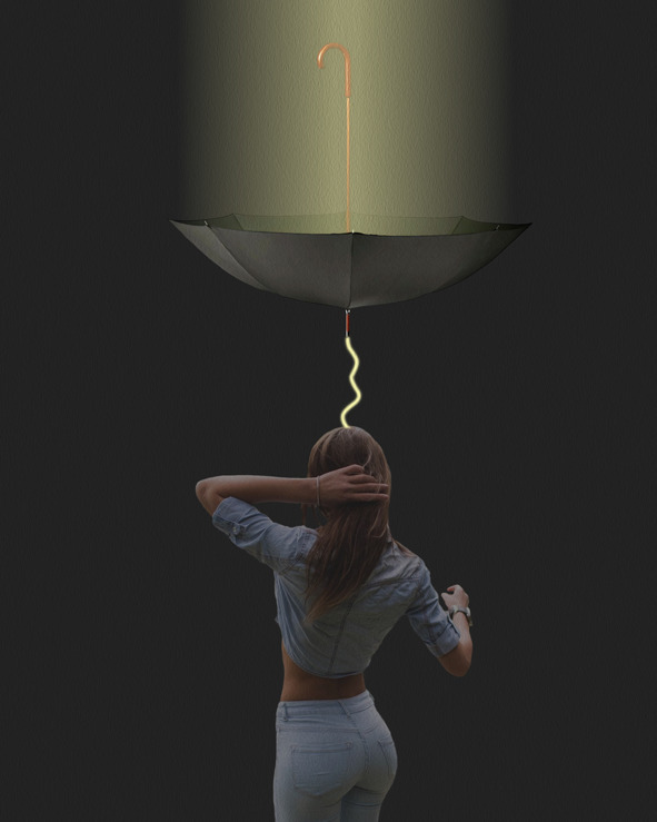 Я увидела себя со стороны, стоящей в невесомости без пола и стен на фоне серого цвета бесконечного пространства. Над моей головой находился зонт чёрного цвета, его ручка была сделана из гладкого дерева в виде трости с текстурой полированного, покрытого лаком вяза. Конец трости был классически завёрнут в полукруг, спицы зонта выглядели металлическими, я бы даже сказала хромированными, а на конце красовались заклёпки, также выполненные в классической форме. Зонт был раскрыт, но повёрнут тростью вверх, и его колпачок, то острие, соединяющее спицы в центре, смотрел ровно на мою голову, не дотягиваясь до неё сантиметров тридцать. Над зонтом стоял столб льющегося света – это была плотная материя переливающихся волокон жёлтой светящейся массы. Такая же масса, только тонким потоком, выходила из острия колпачка, соединяющего спицы на наружной части зонта, и уходила прямо в мою голову в центре черепа, в область темечка.