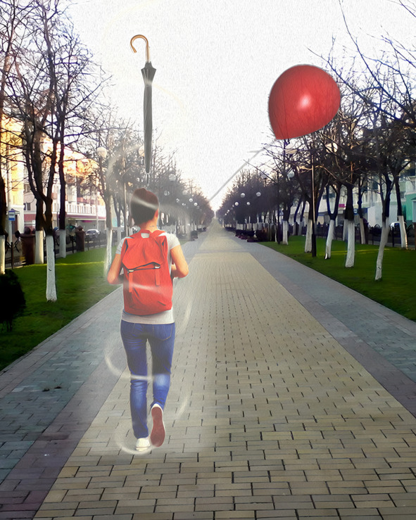 Свернув на второстепенную пешеходную улочку, я вдруг поняла, что вижу себя идущей по улице как бы со стороны. Ракурс был со спины и чуть выше. Я смотрела на себя как привязанный сзади на верёвочке шарик. Причём это было своего рода двойное зрение. Описать его сложно, но я одновременно видела и дорогу своими глазами и себя сверху – глазами привязанного шарика. Над моей головой находился всё тот же зонт, перевёрнутый вверх тростью, но на этот раз он был сложен и просто висел в центре потока ярких волокон, которые падали и на мои плечи в том числе. Так продолжалось минут пять. Я шла по дороге и видела себя в двух проекциях одновременно.