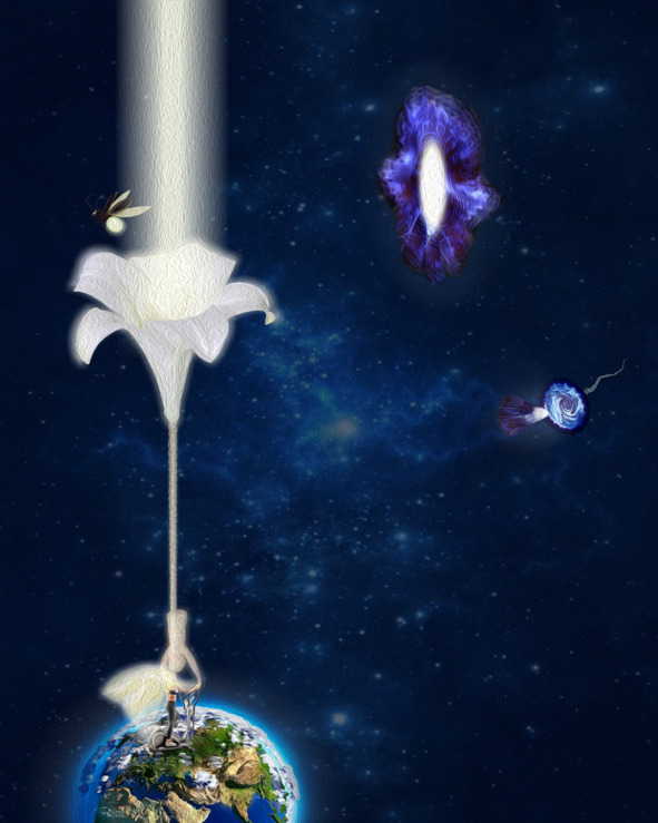 Пройдя очередной круг, видение начало двигаться дальше. Я увидела канат, идущий из основания моей головы вверх. Он был составлен из полых квадратиков, соединённых вместе, а на самом его верху красовался бутон лилии, который открылся при моём приближении, и в него начал вливаться поток света. Из открывшегося цветка тут же вылетел светлячок, причём он почему-то был мультяшным и всё время вертел передо мной своей жопкой-шариком, светящимся, как лампочка. Он полетел наверх всё выше и выше и там, в очередной раз повернувшись ко мне попкой, стал превращаться в нашу планету, в Землю, на которую я смотрела теперь со стороны.