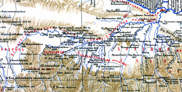 Карта Сунженской линии. Из книги «Исторический очерк кавказских войск от их начала до присоединения Грузии», Тифлис, 1899 г.