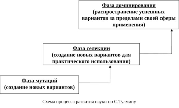 Исследование развития научного знания, проведенное К. Поппером, Т. Куном, П. Фейерабендом, подготовило распространение аналогии между научным и биологическим развитием. Наиболее ярко и последовательно эта аналогия проводится в эволюционной эпистемологии С. Тулмина11. По мнению этого автора, для описания взаимодействия трёх автономных эволюционных процессов справедлива та схема, которую он создал для описания процессов развития науки, а именно: создание новых вариантов (фаза мутаций) – создание новых вариантов для практического использования (фаза селекции) – распространение успешных вариантов внутри каждой сферы на более широкую сферу науки и техники (фаза диффузии и доминирования). Подобным же образом связаны техника и производство. Тулмин также отрицает, что технику можно рассматривать просто как прикладную науку. Во-первых, неясно само понятие «приложение». В этом плане законы Кеплера вполне могут рассматриваться как специальное «приложение» теории Ньютона. Во-вторых, между наукой и техникой существуют «перекрёстные связи» и часто бывает трудно определить, находится «источник» какой-то научной или технической идеи в области науки или в сфере техники.