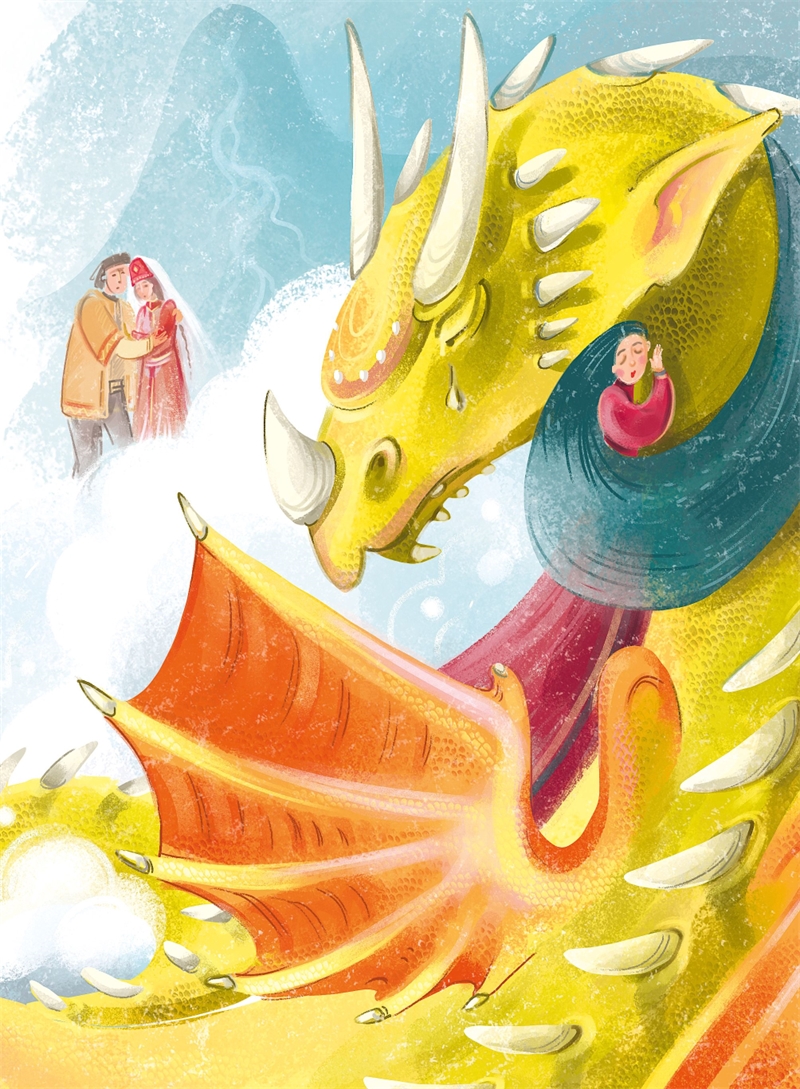 Девушка испугалась, но он принялся просить-умолять, даже слезу пустил, горячую, драконью, она землю на метр прожгла. Трепеща, девушка наконец согласилась, распустила косу и обмотала волосы вокруг его шеи. В ту же секунду драконья шкура с него упала, и вишап превратился в её любимого брата.