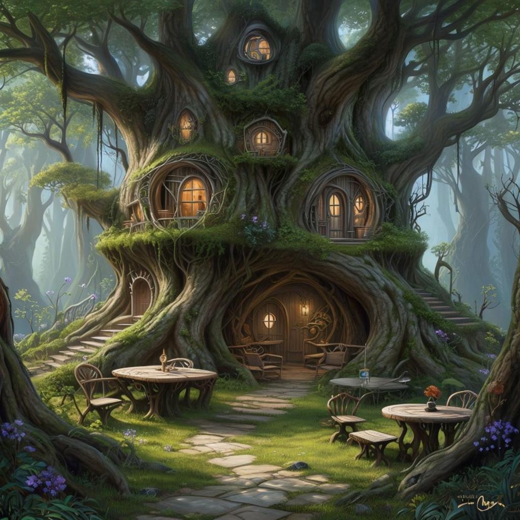 Немного пройдя, мы оказались в очаровательном поселении, скрытом от посторонних глаз. Дома дриад, словно живые, произрастали прямо из стволов деревьев, являясь их естественным продолжением. Впрочем, возможно, так оно и было, ведь прямо на наших глазах дриады выращивали из земли массивный стол и лавки вокруг него.