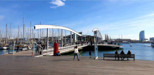 Приморский район, начинающийся от Рамблы, пляжей не имеет. Это, скорее, место для неспешного променада вдоль моря с видом на холм Монжуик и многочисленные шикарные яхты. Если от монумента Колумбу вы перейдете дорогу в сторону моря, то окажетесь на деревянном настиле Рамблы-де-Мар, повисшем прямо над морем. Он имеет даже разводную часть, сдвигающуюся в сторону для прохода судов. Прогуливаясь по полосам досок, подставляя лицо яркому солнцу, можно ловить яркие блики на воде и любоваться силуэтом крепости Монжуик, почему-то именно отсюда кажущейся особенно зловещей. Рамбла-де-Мар плавно ведет к торговому центру и аквариуму Барселоны. Этот район носит название «порт Велл», и в основном используется для парковки частных яхт. Прогуливаясь по каменной набережной, вы сможете увидеть, как красные кабинки канатной дороги неспешно плывут на Монжуик и обратно.