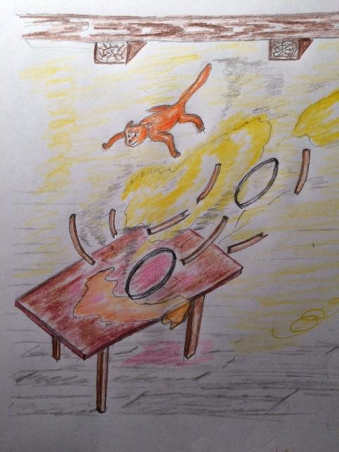 Кот Котыч, тем временем, занял господствующую над залом позицию, что характерно вообще-то для кошачьих. Позиция эта располагалась на деревянной балке, идущей под потолком поперек зала и прямо над бочкой с мороженым. Глаза Котыча метали желтые молнии, их целью были тройка исполнителей в красных рубахах, гармонь и излучающая холодный розовый свет бочка.