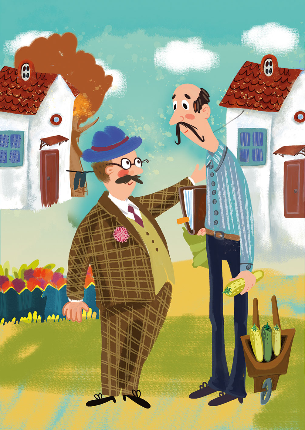 В Мышгородском университете работают два всемирно известных учёных – профессор Великанов и профессор Крошкин. Они не только коллеги, но и соседи. Если на центральной площади сесть на автобус № 5, проехать на нём ровно три остановки до гастронома, а потом пройти немного вперёд по Дубовой аллее, то в самом её конце можно увидеть два стоящих рядом домика. Они очень похожи. Оба беленькие, с красной черепичной крышей. Только у одного занавески на окнах в зелёную клеточку, а у другого – в синюю полосочку. В этих домах и живут учёные. В домике с зелёными клетчатыми занавесками – профессор Великанов, а в соседнем – профессор Крошкин.