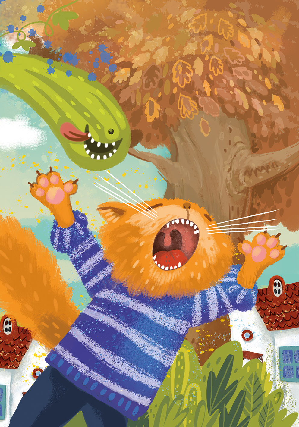 Но не успел кот положить кабачок на полку, как тот вдруг… оглушительно залаял! Бедный Амадей от неожиданности и страха подскочил на месте, а потом пулей вылетел из скворечника. Опомнился он только на улице. Осознав, что под ним нет ни лестницы, ни ветки дерева, он судорожно забил лапами, пытаясь удержаться в воздухе, и с диким воем рухнул в кусты.