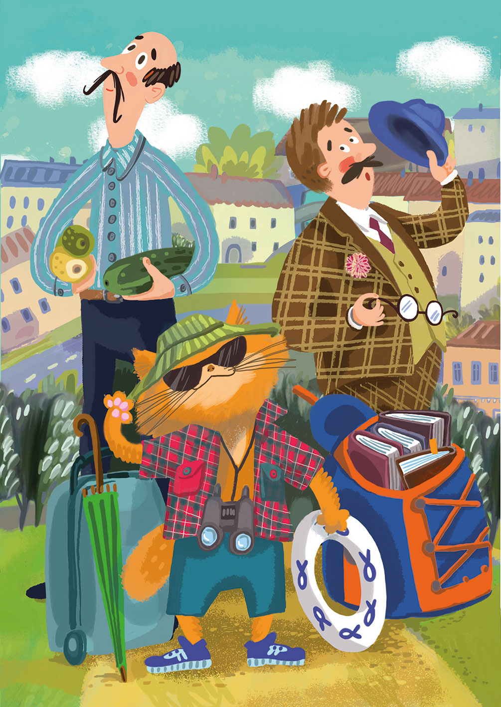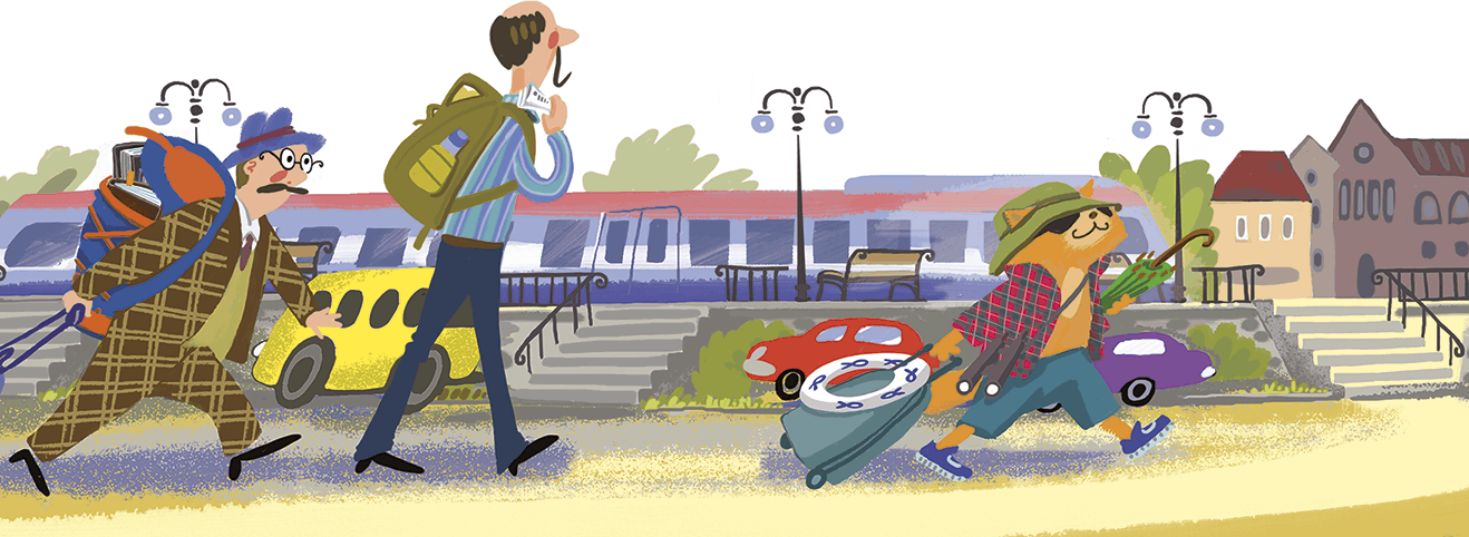 И вот настал долгожданный день. Ранним воскресным утром по перрону мышгородского вокзала бодро вышагивала дружная компания. Впереди, сгибаясь под тяжестью неподъёмного рюкзака, семенил профессор Великанов в клетчатом костюме. С профессора, несмотря на раннее утро, градом катил пот. Но Великанов был бодр, весел и насвистывал под нос популярный мотивчик. Следом за Великановым тащился профессор Крошкин. Он катил за собой среднего размера полосатый чемодан на колёсиках. За Крошкиным шёл Амадей, на голове которого красовалась зелёная панама. На нос кот нацепил огромные тёмные очки, которые то и дело съезжали набок. В одной лапе Амадей нёс чемодан, а в другой – гигантский зелёный зонт-трость (Кот очень боялся, что на пляже ему не достанется зонтика от солнца).