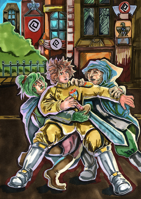 Кассиний выдохнул, закрыл глаза, быстро прошептал молитву и направил айзена прямиком на горюна. Ящер попытался атаковать железного противника, но монах успел поразить его огнём. Подожжённый гад, оставляя за собой след зловонного бурого дыма, упал на проспект. Кассиний же подогнал айзена к Магистериуму. Было видно, что механизм слушается его с трудом, но настоятель всё же сумел совладать с ним и заставил Шарлака зависнуть рядом с крышей. Рика, закинув лук за спину, спрыгнула с айзена и подбежала к Рэю.