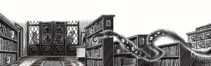 Тим продолжал всматриваться в пустоту коридоров. Внезапно между книжными полками что-то мелькнуло. Что-то быстрое и чёрное. Мальчик отпрянул от окна и споткнулся о стоявшую рядом Аду.