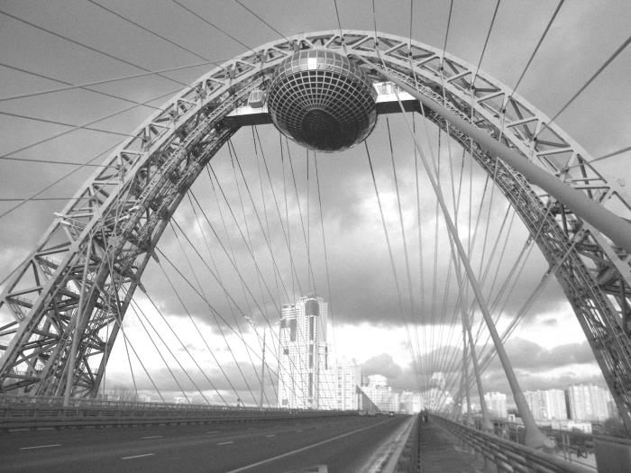 Аналогов этому подвесному мосту нет ни в Москве, ни в России, ни в мире. Эксклюзивность его заключается в том, что традиционный пилон выполнен в виде огромной красной арки, перекинутой с одного берега Москвы-реки на другой. Пролет арки составляет 182 метра, высота 90 метров, в том числе от проезжей части – 70 метров. К арке веером крепятся ванты – высокопрочные тросы из оцинкованных закрытых канатов. Длина подвесного моста без эстакад составляет 410 метров. Его видно даже из самых отдаленных уголков Москворецкого парка – со Строгинского моста, с самого района Строгино.