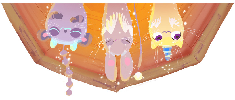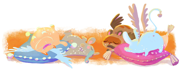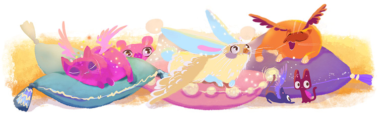 За дверью оказалось просторное помещение с высоким потолком, многочисленными полками на стенах и разбросанными повсюду подушками, на которых лежали пушистые зверьки с клювом вместо носа и крыльями на спине. Шёрстка у каждого мерцала разными цветами: золотистым, розовым, зелёным, лиловым, аквамариновым. Когда несколько зверьков собирались рядом друг с другом, над ними возникала маленькая радуга.