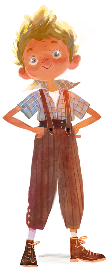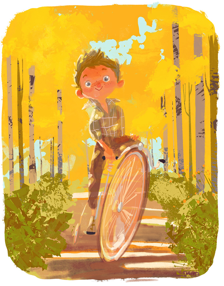 Вика выглянула в окно и увидела, как по дорожке, выложенной зелёными и жёлтыми плитками необычной формы, едет старинный велосипед с огромным передним колесом и крошечным задним. На вершине этой конструкции гордо восседал мальчишка лет двенадцати, в серых штанах и расстёгнутой клетчатой рубашке поверх белой майки. Остановившись у крыльца, он ловко спрыгнул на землю, обнял майстера Нилса, и они зашли в дом.
