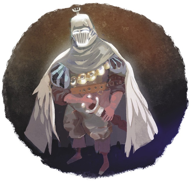 И вот в чёрных клубах появилась массивная, громоздкая фигура, в которой Вика не сразу признала человека. На нём были доспехи из белых пластин, которые позвякивали при каждом шаге, на поясе висели ножны, то и дело задевавшие кольчугу и добавлявшие своё бряцанье в какофонию металлических звуков. С плеч на землю красивыми складками спадал белоснежный – ни пятнышка! – плащ. Но поразительнее всего Вике показался необычный головной убор, тоже белый – нечто среднее между рыцарским шлемом и шлемом космического скафандра; именно он больше всего превращал фигуру незнакомца в странную и не совсем человеческую.