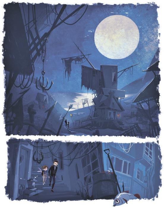 А сейчас чем ближе Вика подходила к городку, тем уродливее он становился: приземистые дома угрюмо глядели тёмными проёмами окон, вывески зловеще поскрипывали под порывами ветра, тощие собаки дрались за кость, в подворотнях мелькали мрачные тени, под ногами хлюпали помои, а у дверей клубились чёрные клочья тумана из обид, разочарований и горестей. Ночь пахла подвалом, тоской и рыбьими потрохами.