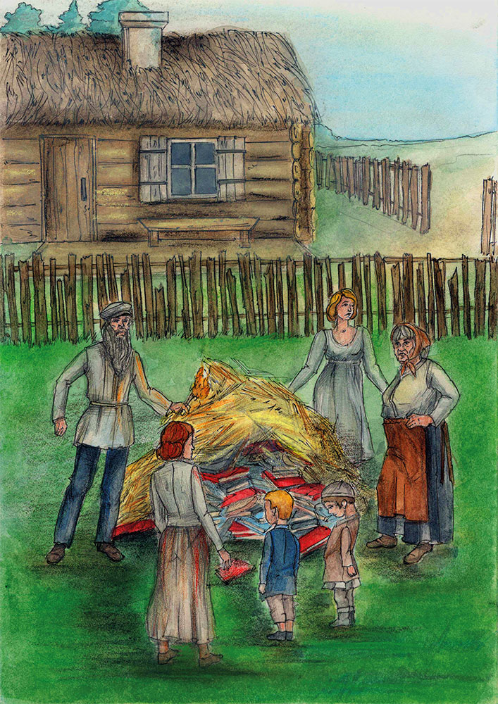 Книги выносили охапками и перебрасывали через плетень, отделявший двор от огородов. Там дед сгребал их вилами в кучу. Она получилась достаточно большой – около метра в высоту. После этого он растребушил над ней несколько обмолоченных снопов и застыл в нерешительности. Надо было теперь все это поджигать, но он медлил. Наконец, прошептав какую-то молитву и перекрестившись, он поджег солому с разных сторон.
