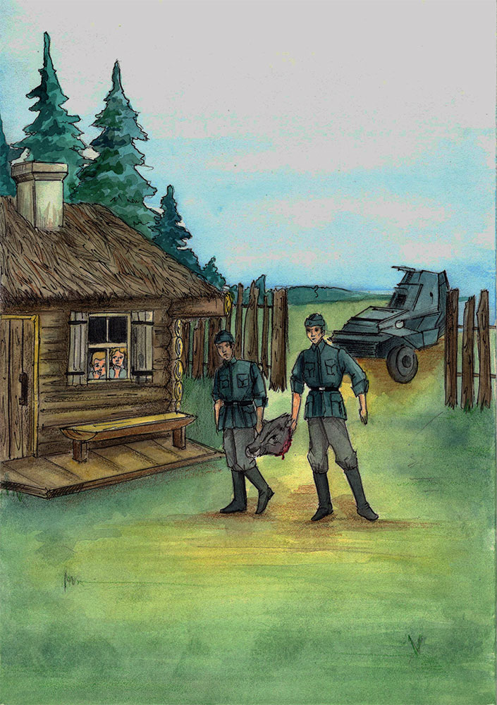 Из бронемашины вышли солдаты. Они взяли за уши поросячью голову, внесли ее к нам во двор, положили на крыльцо и молча, ничего не говоря, ушли. Через несколько минут броневик затарахтел и удалился туда же, откуда и приехал.