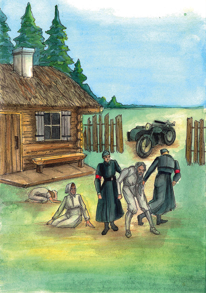 На следующий день мы, не отошедшие еще от происшедшего накануне, услышали тарахтенье у хаты. Выглянув в окно, увидели, что возле калитки остановился мотоцикл с коляской. Через мгновение два здоровенных немца в зеленых плащах с красными повязками на рукаве буквально ворвались в хату и, ничего не говоря, схватили деда за бороду и потащили его к мотоциклу. Дед был в одном исподнем. Женщины, не сговариваясь, дружно бросились на них, пытаясь вырвать деда из их рук. Немцы, не церемонясь с женщинами, ударами в грудь уложили их на землю, втолкнули деда в коляску и укатили.