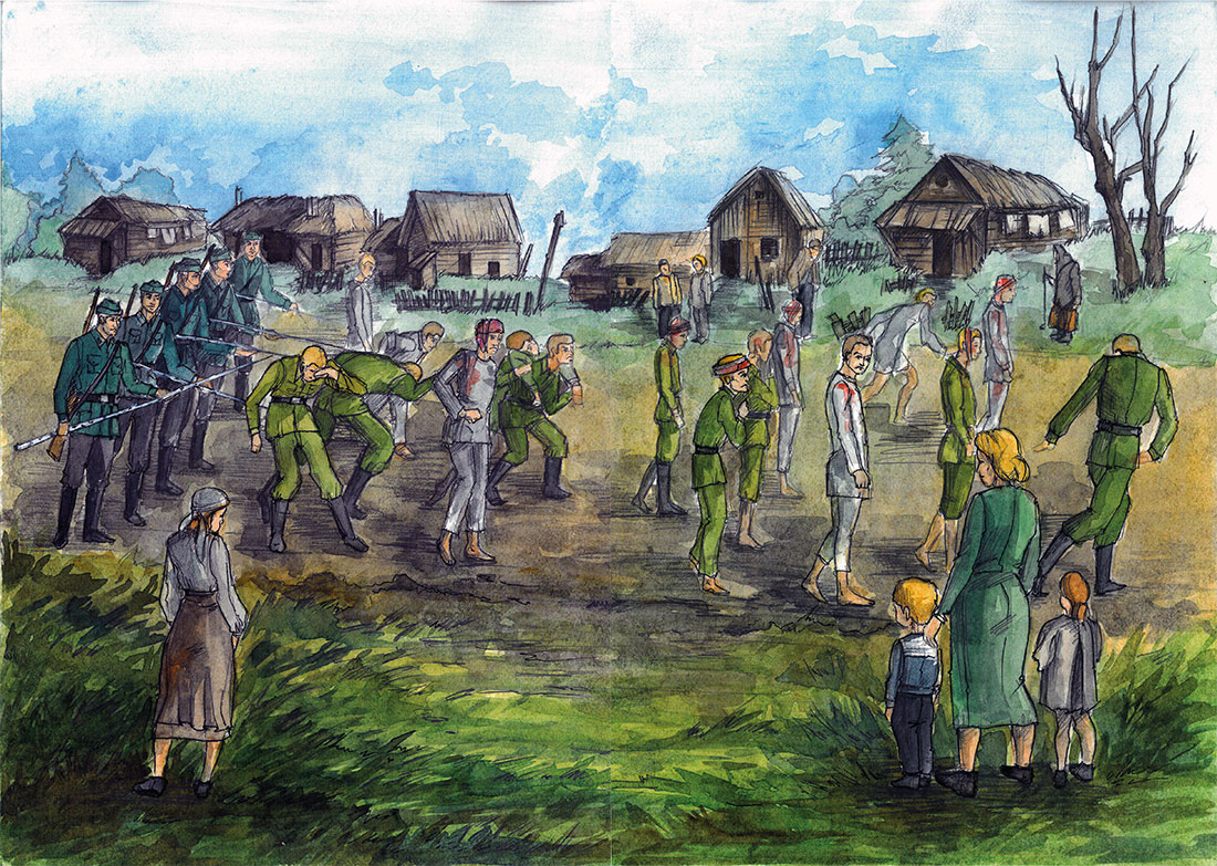 Когда мы шли к Кале, улицы были почти безлюдными. Изредка из хаты выходила какая-нибудь старуха и тотчас же исчезала за плетнем. Сейчас же мы увидели на Аверьяновке какое-то оживление. Из хат выбегали женщины и выстраивались вдоль улицы, по которой со стороны Ветки двигалась какая-то плотная масса людей. Мы застыли у калитки, ожидая, когда эта масса приблизится к нам и можно будет разглядеть их. Через некоторое время картина прояснилась – это была колонна пленных красноармейцев. Некоторые из них были в нательных рубахах и босиком. Из-за окровавленных бинтов, которыми были обмотаны их руки, шеи и головы, колонна имела пестрый вид. Тяжелораненых поддерживали товарищи – кого только с одной стороны, а некоторых – с двух. При этом создавалось впечатление, что колонна двигалась сама собой, так как ни впереди, ни по бокам конвоиров не было. Только когда ее хвост поравнялся с нами, мы увидели странное зрелище. За последним рядом красноармейцев, которые были все босиком, шли немцы, тоже выстроенные в ряд. У всех у них винтовки были за спиной, а в руках – длинные березовые палки с заостренными концами. Остриями этих палок они время от времени кололи пятки красноармейцев, не давая тем расслабляться. Те толкали руками в спину впереди идущих, заставляя их ускорять шаг. В результате, несмотря на большое количество раненых, еле переставлявших ноги, колонна двигалась довольно быстро. В таком темпе не ходили до войны даже здоровые красноармейцы. Я не раз видел их колонны, идущих с песнями по улице или на параде в военном городке.