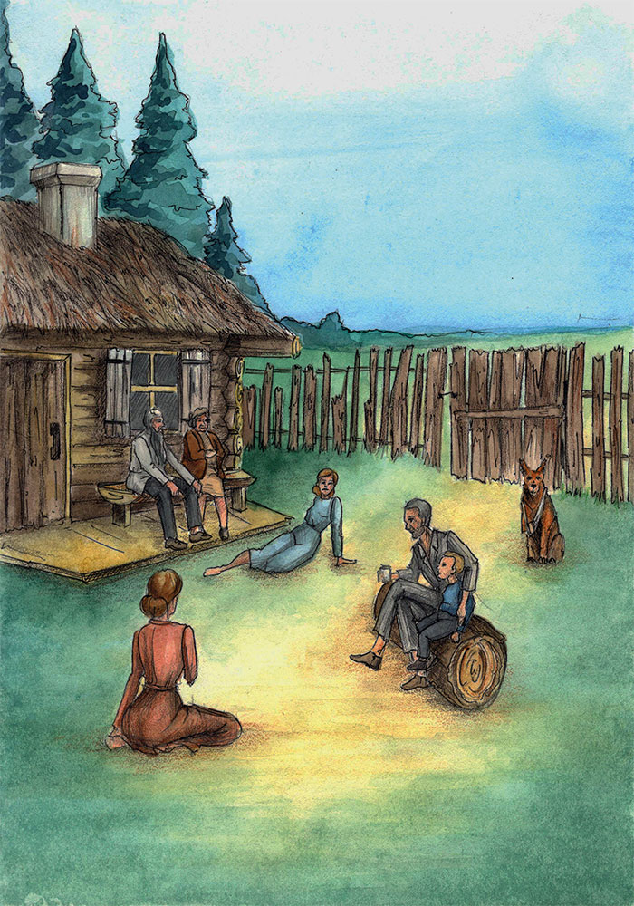 Когда я прибежал к воротам, то увидел, что на завалинке лежали лопата, пила и топор, а дядя Алексей был накрыт шинелью, в которой дед пришел с Германской. Это была реликвия, которую дед бережно хранил. Увидев меня, дед взял пилу, махнул мне рукой и пошел к брошенной красноармейцами фуре, стоявшей у плетня. Вдвоем мы быстро отпилили дышло. Это был длинный зеленый брус. Его дед отнес к телеге и засунул под сено. Затем пристроил в кузове телеги пилу, топор и палку дяди Алексея, а лопату сунул мне в руки, хотя мог и ее туда же положить. Просто он старался не оставлять меня наедине с мыслями и поручал мне всякие мелкие дела.