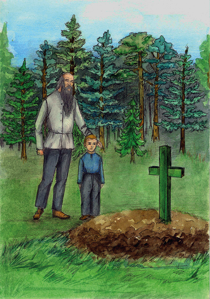 Когда я нарубил несколько охапок лапника и принес их к телеге, то увидел, что могила была уже выкопана, правда, не очень глубокая. Ее края не доходили даже до пояса деда. Желтый песок, выброшенный на поверхность, лежал только с одной стороны могилы, а с другой, где стояла телега, была ровная чистая площадка. Выложив частью лапника дно могилы, дед выбрался на поверхность, обошел могилу вокруг, оценивая свою работу, и, по-видимому, остался доволен.