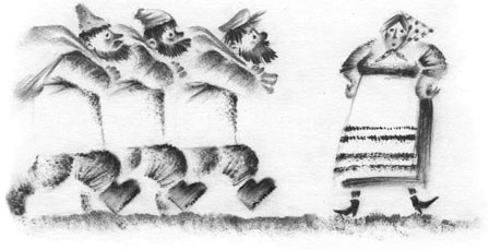 Чуть поодаль топтались на месте трое рослых мужчин. Вернее сказать, мужиков. Они странным образом были похожи друг на друга: небритые лица, растрёпанные волосы соломенного цвета, рубашки без пуговиц из грубой ткани. За спиной у каждого висел холщовый мешок, и внутри кто-то копошился и мяукал.