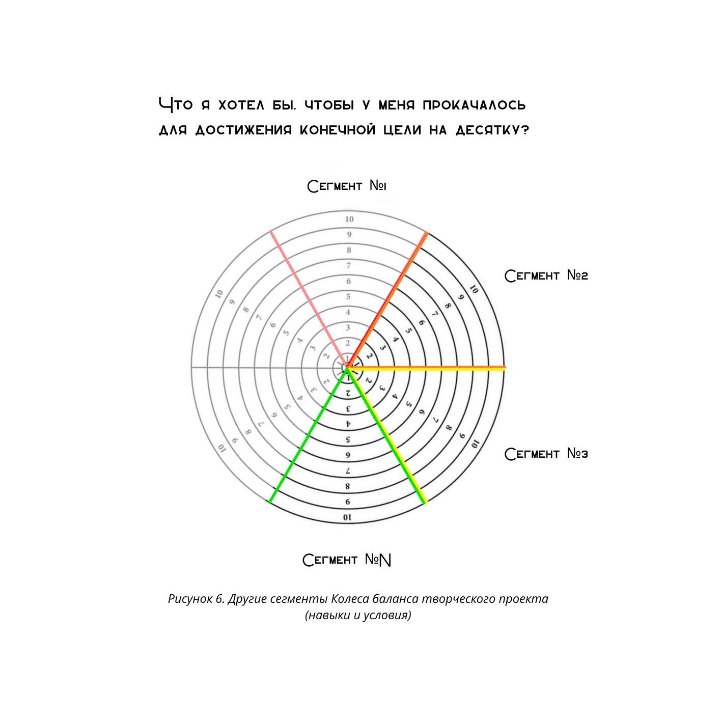Ещё раз обрати внимание, что в том случае, если для достижения конечного результата тебе нужно встроить в себя много навыков или создать много условий, ты можешь сгруппировать их в один сегмент. Тогда под цифрой «1» у тебя будет первый навык, под «2» – второй, а под «10» – десятый. Но это удобно лишь там, где навыки относятся к одной группе. Например, «Научиться писать живые диалоги», «Научиться ёмко и коротко описывать внешность героев» и т. д. Если же тебе нужно, к примеру, настроить самодисциплину и освоить редактуру, их лучше разносить по разным сегментам и делить на шаги.
