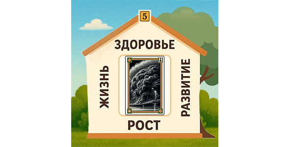 Дерево в своём Доме указывает на судьбоносное здоровье – то, которое является отражением всего жизненного пути человека. В положительном контексте это символ долголетия, крепких корней, выносливости. Если же рядом есть негативные карты, то проблемы будут серьёзными, но всё равно они воспринимаются как часть «жизненного сценария», ведущего к росту и внутреннему развитию.