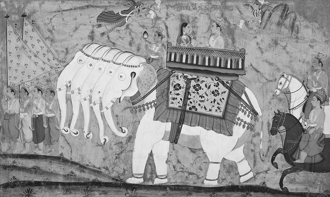 Индра и его супруга Шакти (Шачи) верхом на слоне Айравате. Иллюстрация из старинного индийского манускрипта