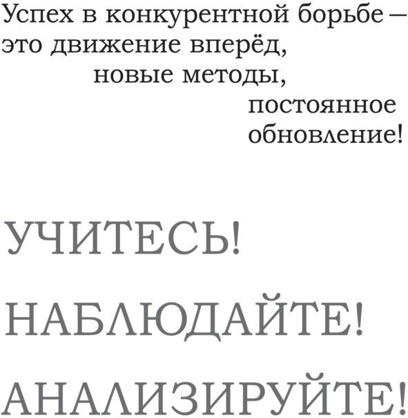Учитесь у самых сильных и успешных – это наиболее эффективный способ первоначального накопления капитала быстрее конкурентов. Но не воруйте интеллектуальную собственность, не нарушайте авторские права: можно украсть ведро воды, но нельзя украсть сам источник.