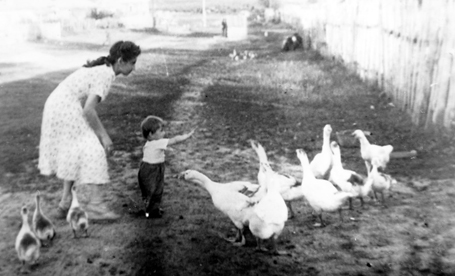 Мама, я и гуси. с. Евдаково, 1952 г. Семейный архив