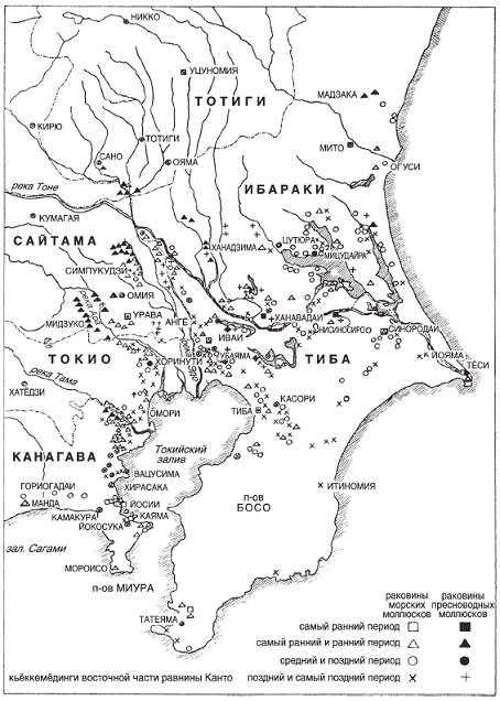 Если кьёккенмёдинги, расположенные ближе всего к нынешнему берегу моря, соединить линиями, то возникнет совершенно иная картина – мы увидим побережье периода Дзёмон. Так, в доисторические времена не существовала территория, которую в настоящее время занимает восточная часть Большого Токио, а два обширных озера в префектуре Тиба были тогда частями широких морских заливов. Подобная топографическая ситуация в основном преобладала и в районах, находящихся вдали от побережья залива Сендай, хотя и в несколько меньших масштабах. Равнина Китаками имеет не столь древнее происхождение, и ее озера образовались после того, как отступило море. Раковинные кучи расположены по всей равнине, причем многие из них – четко вдоль линии берега; кроме того, они разбросаны по островам заливов Мацусима и Исиномаки. В префектуре Аомори около Хатинохе и по берегам озера Огавара эти археологические памятники тоже встречаются: в доисторических заливах природа создала очень благоприятные условия для колоний моллюсков, таким образом обеспечив пищей древнего человека. Такая же ситуация складывалась и в других заливах, особенно в бухтах более теплого восточного побережья.