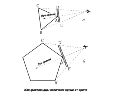 Предположим, что ко мне приближаются два индивидуума, ранг которых необходимо установить. Условимся считать, что один из них купец, а второй врач, или, иначе говоря, один – Равносторонний Треугольник, а другой – Пятиугольник. Каким образом я могу различить их?