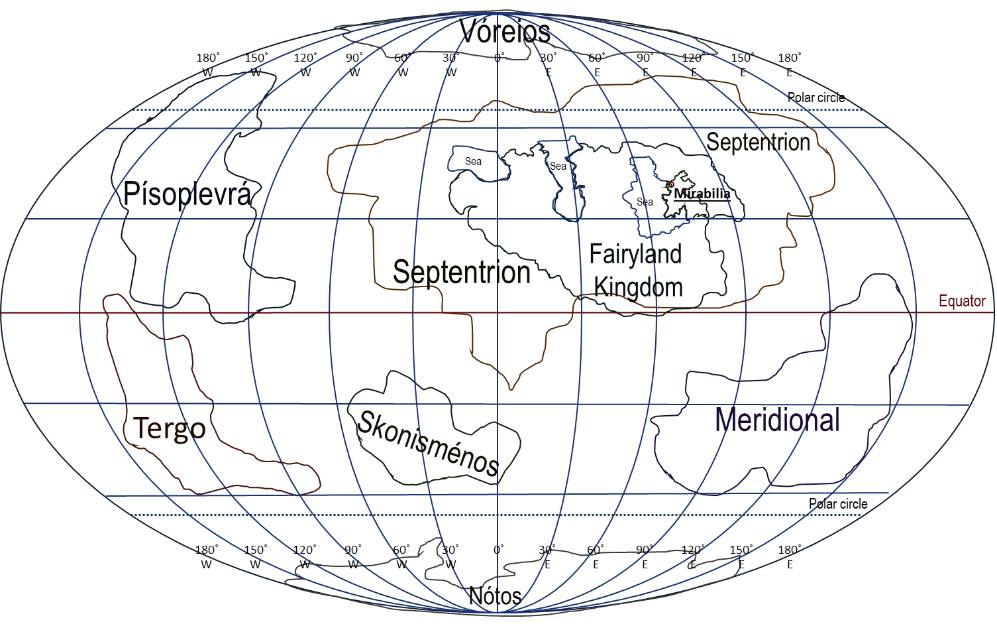 Экзо-планета Земля оказалась не многим отлична от статус-кво Земли. Климатические зоны и их распределение по поверхности планеты были схожи, лишь на карте красовались другие очертания континентов, океанов и островов. По глобусу, продемонстрированному Вальтером, расположились 7 материков. Фэриландия находилась в самом большом из них, называемом Септентрион24, в древности именуемой северной землей, поскольку большая ее часть находилась в северном полушарии. К юго-востоку расположился другой континент в народе известный, как южная земля, а по географическому названию Мередиональ25. Он занимал третье место по площади среди континентов. Двигаясь к юго-западу от Септентриона можно попасть в самый маленький материк, под названием Сконисменос26. Два оставшихся континента скрывались в другой стороне глобуса по площади близкие друг к другу – на северном полушарии Писоплерва27, а на южном полушарии Тэрго28. В полюсах планеты образовались заснеженные вечномерзлые материки Вориос29 на севере и Нотос30 на юге.