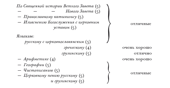 Судя по экзаменационным ведомостям, за первый класс семинаристы сдавали священное писание, русскую словесность, гражданскую историю, математику, грузинский и греческий языки, славянское и грузино-имеретинское пение. В ассистентской ведомости Иосифу Джугашвили по всем предметам поставлены 5, лишь по греческому языку – 4. В преподавательской кроме греческого 4 стоит еще по гражданской истории и 4 с плюсом по математике[147].