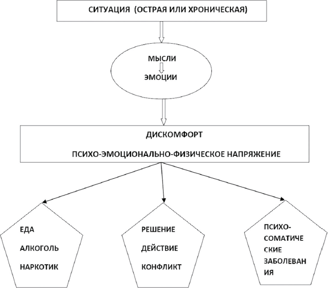 Возникает или существует хроническая травмирующая ситуация. По этому поводу возникают мысли, появляются эмоции, возникает дискомфортное состояние и затем психо-эмоционально-физическое напряжение. Затем человек предпринимает какое-то решение для себя, ещё оно может выражаться конкретным действием, а иногда и приходится конфликтовать с внешним миром.