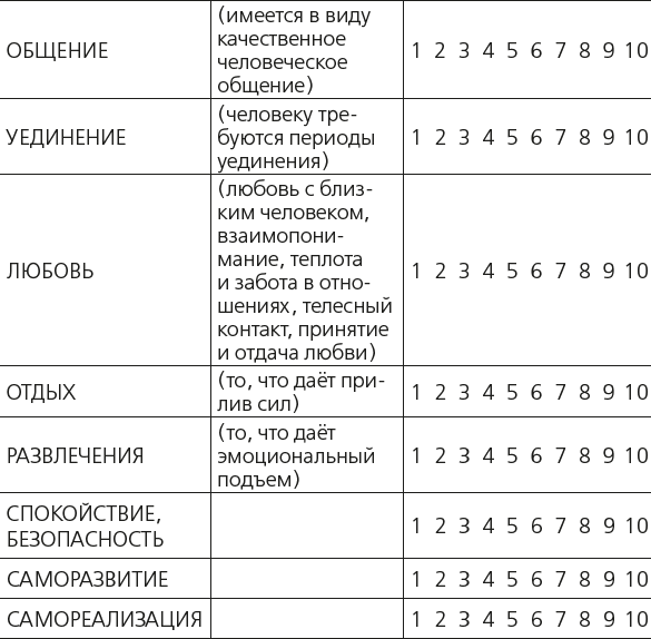 Можете сразу поставить себе отметку (долго не задумываясь), как вы можете оценить реализацию каждой потребности в данный жизненный период по шкале от 0 до 10.