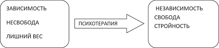 Пищевая аддикция, как и любая другая аддикция – это зависимость, состояние несвободы. Чтобы освободиться от зависимости, нужно обрести состояние свободы. Свободы от страхов, сожалений, уныния, нереализованности, в т. ч. нереализованности своей женской сущности. После обретения этой свободы наступает и свобода от перееданий. Состояние свободы начинается с принятия и любви к себе и к своей жизни, причём безусловной любовью – какими бы вы и ваша жизнь на данный момент не были. И психотерапия призвана этому помогать и способствовать.