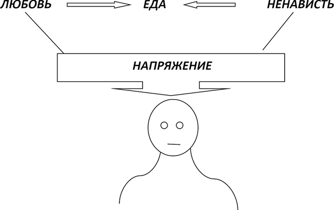 То есть, двойственное отношение к одному и тому же объекту и абстрактному понятию. Такая двойственность, одновременная любовь и ненависть к еде даёт человеку большое хроническое напряжение в психике. И чаще в дополнение к уже имеющимся напряжениям в психике, которые и так долго существовали у людей с лишним весом и ожирением.