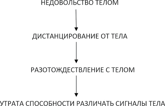 Постепенно из-за нарастающего недовольства своим телом происходит «дистанцирование» от него, разотождествление себя настоящего от этого «мерзкого жира». Чем больше подавленных эмоций удерживается в теле, тем больше человек хочет от него дистанцироваться. И, как следствие, нарушается способность слышать сигналы тела, в частности: сигналы физиологического голода и физиологического насыщения. А те формы физической активности, которые выбирает человек, не приносят ему радости, т. к. это не совпадает с желаниями его тела, сигналов которого он не слышит.