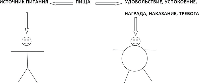 Даже если вы похудеете, но с едой будут отношения, выходящие за рамки физиологической потребности, такое похудание будет страданием и может быть весьма ограниченным по времени. Если еда для вас объект, который может подарить или забрать у вас радость, быть причиной гордости, стыда, ненависти, вины – у вас всё ещё пищевая зависимость, т. к. вы продолжаете выстраивать какие-либо отношения с едой, помимо физиологических. И диеты, ограничения в питании, различные пищевые стратегии, даже идеально выбранные, способствуют только еще большему укреплению этих эмоциональных отношений с едой. Да, еда приносит радость всем людям. Но проблемой еда становится, когда она является основной радостью в жизни и/или предметом тревоги.