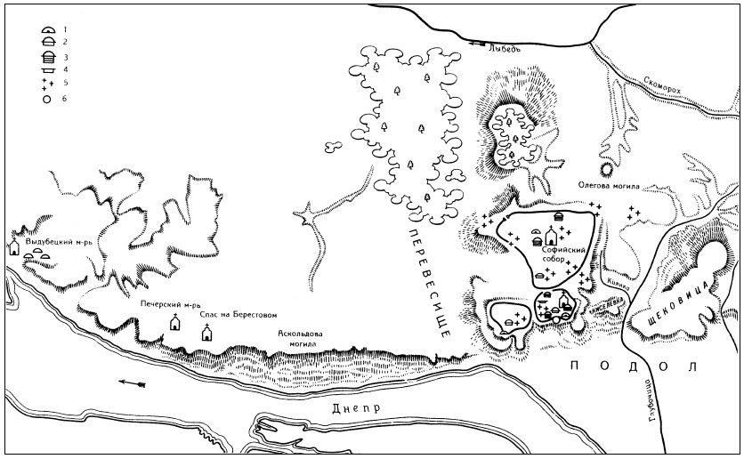 1 – курганные погребения с трупосожжением IX–X вв.; 2 – курганные погребения с трупосожжением в гр> вой могиле IX–X вв.; 3 – погребения в срубных гробницах IX–X вв.; 4 – погребения в грунтовых мог конца X – начала XI в.; 5 – церковные кладбища XI–XII вв.; 6 – братские могилы XIII в.