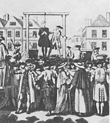 Казнь через повешение на Гревской площади. Часто единственным выходом из каземата Бастилии была именно дорога на эшафот. Парижская толпа воспринимала казнь осужденных как увеселительное мероприятие и бурно реагировала на происходящее.