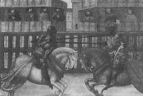 Средневековое изображение рыцарского турнира. На одном из таких турниров получил смертельную рану в глаз Генрих II – это сочли Божьей карой за процесс над протестантом Анн дю Буром.