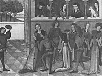Бал при дворе. Средневековое изображение. Большим любителем подобных развлечений и пажей-миньонов, опустошавших французскую казну, был Генрих III, убитый фанатиком из Католической лиги Гизов.