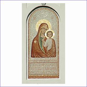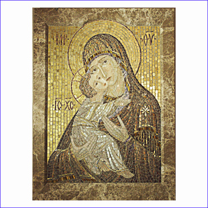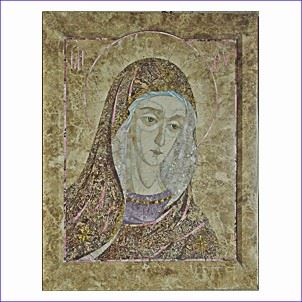 "Богоматерь Владимирская" римская мозаика 89 х 65 см мрамор, яшма, тигровый глаз, беломорит, сердолик, халцедон сиреневый, чароит, кварц, кварцит, нефрит медовый,(золото смальта) Мозаика Кафедрального Собора на Малой Грузинской, Москва.