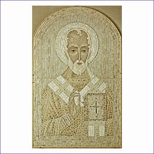 «Николай Чудотворец» римская мозаика 98 х 61 см.:мрамор, кварц, кварцит, кремень белый, оникс, сердолик, флюорит, золото(смальта). мозаика Крестовоздвиженского храма посёлка Мишеронь