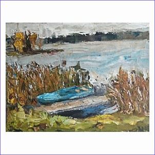 Этюд с синей лодкой, холт, масло, мастихин, 33х42, 2019 год.