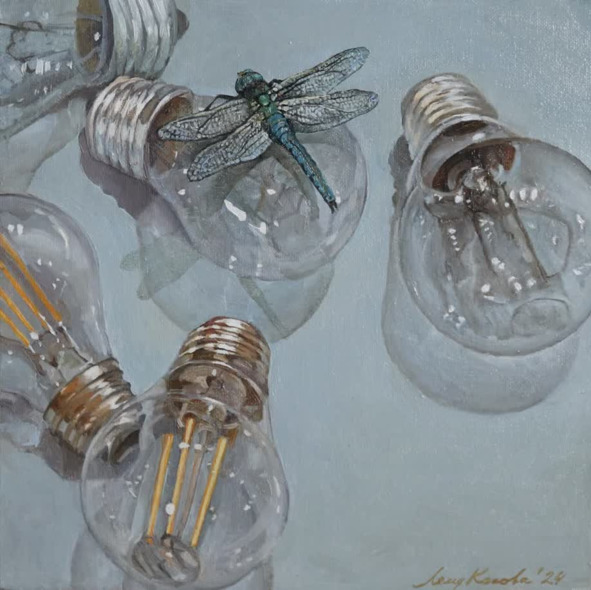 «The Fragility of Being» is a painting that reveals the vulnerability of life through concise symbols. Against a neutral grey-blue background, transparent incandescent light bulbs are depicted – the central metaphor for the fleeting nature of human existence. Their fragility emphasizes our defenselessness against the inevitable. One wants to touch them and feel the delicate glass. The bright highlights of artificial light breaking through the bulbs create a dual sensation: the momentary burning of life and, at the same time, its transience. The main focus of the work is a dragonfly sitting on one of the light bulbs. This symbol of lightness contrasts with its ephemeral nature. The painting was created when the artist learned about her friend’s illness. At that time, it seemed as if a fragile balance had been disrupted and life had developed a crack. Initially, the painting had a different title – «The Fragility of Glass» – but was later renamed by the author, as the message was much deeper: looking at the frozen dragonfly, ready to fly away at any moment, we understand that we must enjoy every second of the life given to us while we have the opportunity. The painting is captivating, it makes you look closer. The artist very subtly conveys the feeling of our life’s fragility. The work demonstrates the author’s ability to create a profound philosophical statement with minimal yet meaningful means, where one detail becomes the key to the meaning. «The Fragility of Being» is a painting about how every moment of our life is priceless.