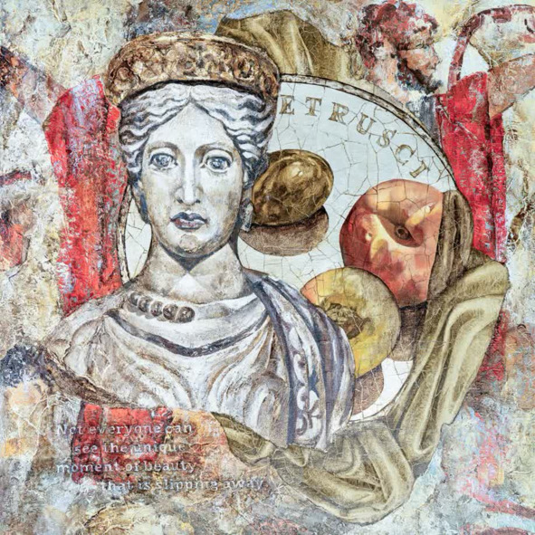 Бюст этрусской богини Уни, покровительницы плодородия, не случайно соседствует с увядающим персиком: даже божественное не вечно. Его не пощадило время: каждый скол, каждая трещинка – словно морщины, за которыми скрывается своя история. Зритель чувствует настроение: горьковатый вкус увядания, легкую грусть по утраченному величию. Работа отражает глубоко личные переживания художницы о том, что жизнь прекрасна, но очень быстро походит. Это – размышления о том, что в погоне за эфемерными целями, мы можем потерять вкус к жизни и перестать замечать ее красоту.